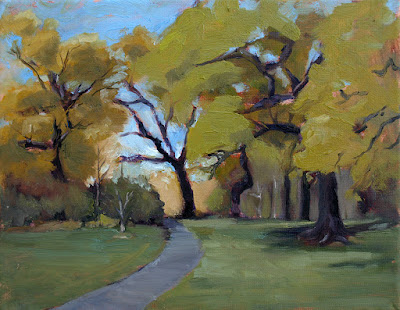 Here's my painting from today's plein air outing with AAC. A lot of the trees are just now starting to get their leaves so there were quite a few different color greens. The park is getting ready for their annual plein air event happening at the end of April. Details here: http://www.olmstedpleinair.com